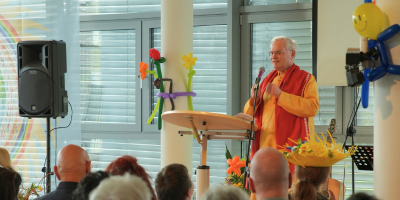 Auf dem Bild neben diesem Text spricht Sukadev Bretz, Gründer und spiritueller Leiter von Yoga Vidya, ein paar Worte zur Eröffnungsfeier des 7. Deutschen Lachyoga-Kongresses. Es ist ein Moment des Willkommens und des gemeinsamen Einstimmens. Solche Augenblicke sind eng mit dem Seminarhaus Shanti verbunden – einem Ort, an dem der Lachyoga-Kongress seit seinen Anfängen zuhause ist und an dem immer wieder Menschen zusammenkommen, um gemeinsam zu lachen, zuzuhören und sich auf gemeinsame Tage einzulassen.