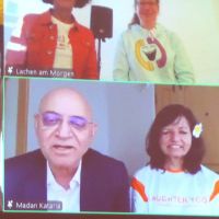 Ein sehr bewegender Programmpunkt war die Online-Lachyoga-Session zur Feier am Sonntagmorgen mit Gästen aus der ganzen Welt. Nobukatsu Okubo stellte mit einer Lachübung das japanische Lachtelefon vor, Christian Hablützel das Schweizer Lachtelefon und Moni Müksch das österreichische. Auch Dr. Madan Kataria und Madhuri, die Gründer der Lachyoga-Bewegung waren anwesend und Madan Kataria bekam virtuell das erste Stück Torte.